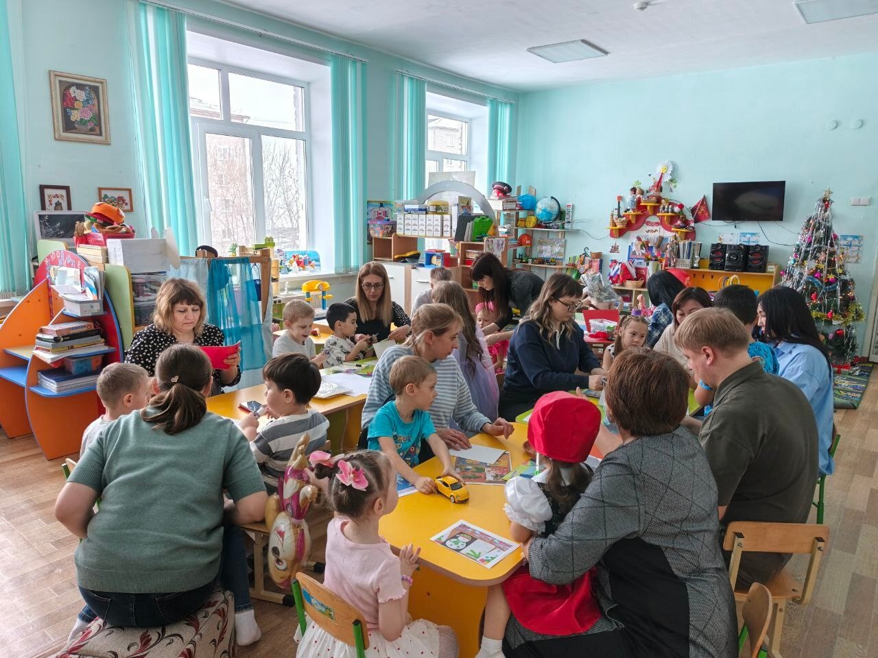 родители с детьми и декорацией